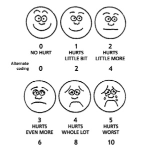 Once a pain management plan is implemented it should be regularly reassessed and changes made as required. Appropriate pain assessment is vital to aid this. This should involve clinical assessment of the child and the use of an appropriate pain scoring tool to identify discomfort and monitor the efficacy of any analgesic intervention. Due to the subjective nature of pain and the lack of a reliable measure many different tools are available. If the child is able to communicate their pain then a self reporting score, such as the “pain faces” (see figure 1) should be used. If the child cannot communicate then other tools using behavioural and physiological signs should are appropriate, the one chosen from the many available will depend on the age of the child, their neurological and cognitive state, and local preference.